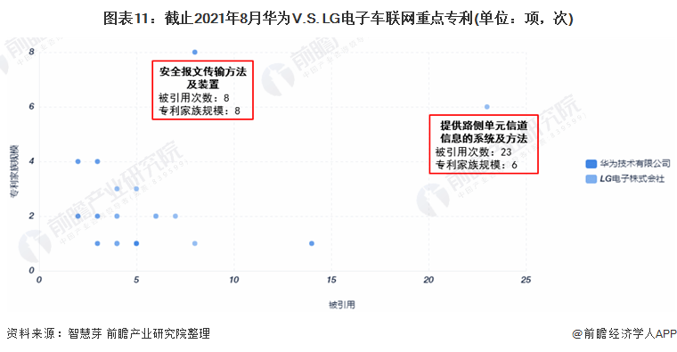(6)重点专利布局对比:LG电子的重点布局的专利被引用次数较多 在重点专利布局上,LG电子重点布局的专利为“提供路侧单元信道信息的系统及方法”,该项专利被引用次数23次,专利家族规模为6项。华为重点布局的专利为“安全报文传输方法及装置”,该项专利被引用次为8次,专利家族规模为8项。整体来看,LG电子重点布局的专利在专利被引用次数上多于华为,而华为在专利家族规模上占据优势。