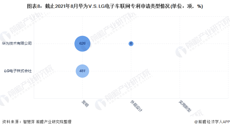 统计口径说明:按每件申请显示一个公开文本的去重规则进行统计,并选择公开日最新的文本计算。 (4)专利类型对比:两者以发明专利为主 华为和LG电子的车联网专利申请类型以发明专利为主。LG电子全部车联网专利为发明专利;华为有6项车联网专利为外观设计专利,其它均为发明专利。