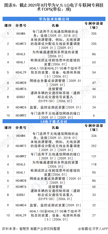 (5)专利技术构成对比:两者布局的第一大细分领域一致,华为聚焦领域更为多元 目前,“H04W4专门适用于无线通信网络的业务;设施[2009.01,2018.01]”为华为和LG电子的第一大车联网技术细分分布领域,两者在这一领域的专利申请量分别为205项和336项。两者其它重点细分车联网技术布局情况如下: