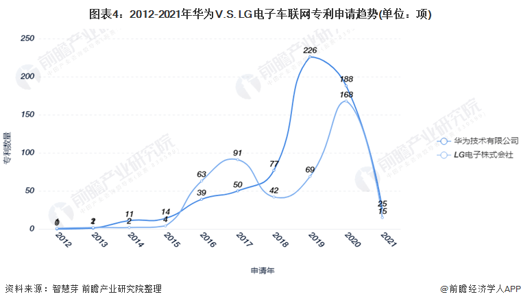 从趋势上看,2012-2018年,华为和LG电子在车联网领域专利申请量“你追我赶”,2018年开始,华为锁定领先地位,两者车联网专利申请量相差最高可达3倍左右。2019年,华为的车联网专利申请量达到226项;LG电子的车联网专利申请量为69项。 2020年,华为和LG电子的车联网专利申请量分别为188项和168项。2021年1-8月,华为车联网专利申请量为25项,LG电子车联网专利申请量为15项。