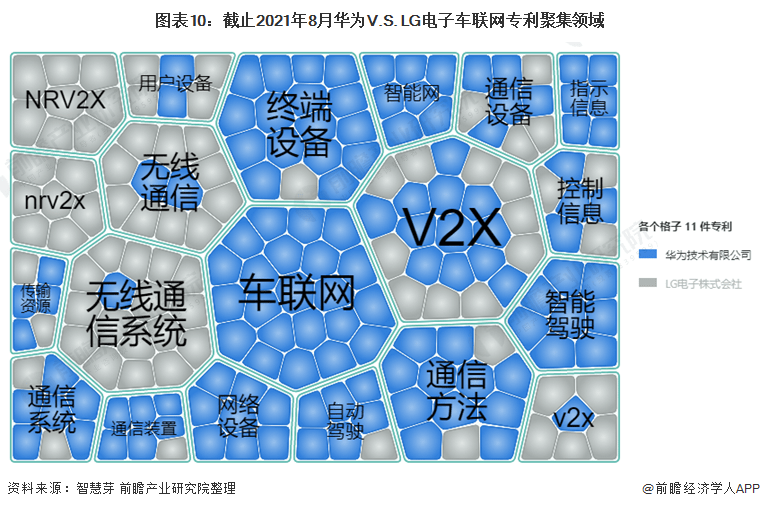 从车联网专利聚焦的领域看,目前华为的车联网专利聚焦领域较多元,其主要聚焦于指示信息、智能驾驶、通信方法、终端设备和V2X等。而LG电子聚焦于NRV2X和无线通信系统。