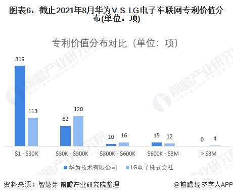 (2)专利市场价值对比:LG电子的专利市场价值更高 LG电子的车联网专利总价值高于华为,LG电子车联网专利总价值为5465.23万美元,是华为的1.6倍左右。在专利价值分布方面,LG电子的大多数车联网专利价值主要集中在3万-30万美元,而华为的大多数车联网专利价值主要集中于3万美元以下。