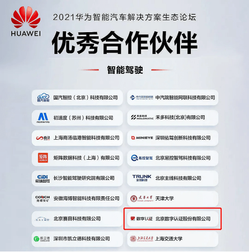 2021年12月21日,“2021华为智能汽车解决方案生态论坛”成功举办,大会回顾了华为与合作伙伴在智能汽车领域共同取得的丰硕成果。作为国内领先的网络安全解决方案提供商,北京数字认证股份有限公司(以下简称“数字认证”)凭借在车联网安全领域丰富的创新应用与实践经验,以及与华为的深度合作,被评选为“2021华为智能汽车解决方案优秀合作伙伴”。