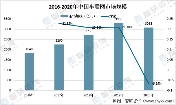 资料来源:国家统计局、智研咨询整理 受疫情等因素影响,2020年中国车联网市场规模约3088亿元,相比2019年下降6.59%。随着多项支持政策密集推出,目前全国已有40多个城市级车联网试点示范,20多个智慧公路车路协同试点示范区,以及5个国家级车联网先导区和2个省级车联网先导区。 2016-2020年中国车联网市场规模