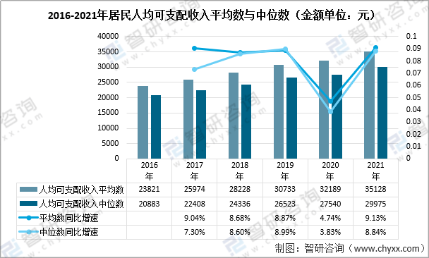 资料来源:政府官网、智研咨询整理 二、车联网行业经济环境分析(E) 2021年,全国居民人均可支配收入中位数29975元,增长8.8%,中位数是平均数的85.3%。其中,城镇居民人均可支配收入中位数43504元,增长7.7%,中位数是平均数的91.8%;农村居民人均可支配收入中位数16902元,增长11.2%,中位数是平均数的89.3%。 2016-2021年居民人均可支配收入平均数与中位数(金额单位:元)