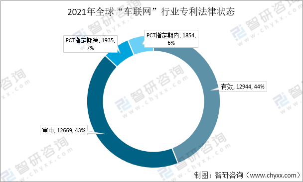 资料来源:智慧芽、智研咨询整理 据数据显示,2021全球“车联网”行业专利法律状态有效期内的最多,数量为12944条,占“车联网”行业专利法律状态总比44%。全球“车联网”行业专利法律审核中的有12669条,占比43%;PCT指定期满的数量为1935条,占比7%;PCT指定期内的数量为1854条,占比6%。 2021年全球“车联网”行业专利法律状态