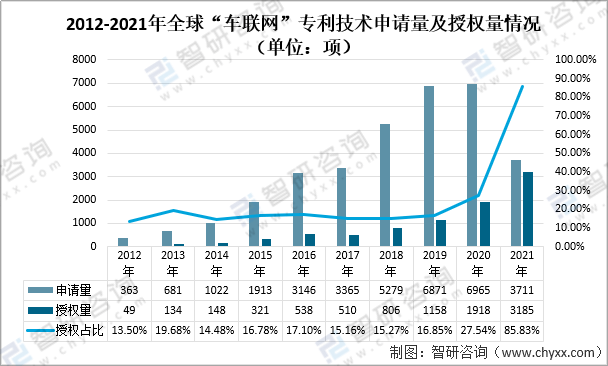 资料来源:智慧芽、智研咨询整理 2021年全球“车联网”专利技术申请量为3711项,“车联网”专利授权量为3185项,授权量占比为85.83%。 2012-2021年全球“车联网”专利技术申请量及授权量情况(单位:项)