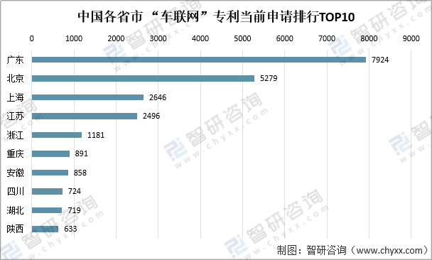 资料来源:智慧芽、智研咨询整理 据数据显示,我国“车联网”专利当前申请量前三省市为广东省、北京市和上海市,这符合我国目前的经济发展形势。我国各地区“车联网”专利当前申请数量最多的是广东省,其“车联网”专利当前申请数量为7924项。北京市“车联网”专利当前申请数量为5279项,上海市“车联网”专利当前申请数量为2646项。 中国各省市 “车联网”专利当前申请排行TOP10