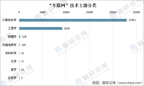资料来源:智慧芽、智研咨询整理 “车联网”技术主题主要分布在计算机科学、工程学和物理学。其中,计算机科学分布最多,“车联网”技术分布多达22951项。其次是工程学,“车联网”技术为9205项;然后是物理学,“车联网”技术为228项。 “车联网”技术主题分类