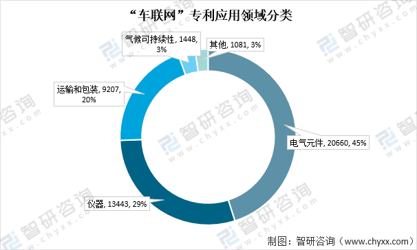 资料来源:智慧芽、智研咨询整理 “车联网”专利主要应用领域在电气元件、仪器、运输和包装、气候可持续性等方面。其中,电器元件领域运用最多,运用数量为20660项,占比45%。仪器领域运用数量为13443项,占比29%;运输和包装领域运用数量为9027项,占比20%;气候可持续性领域运用数量为1448项,占比3%;其他领域运用数量为1081项,占比约为3%。 “车联网”专利应用领域分类