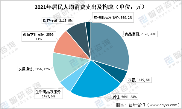 资料来源:国家统计局、智研咨询整理 2021年,全国居民人均交通通信消费支出3156元,增长14.3%,占人均消费支出的比重为13.1%。其他全国居民人均消费支出七大类分别占比为:人均食品烟酒消费支出7178元,增长12.2%,占人均消费支出的比重为29.8%;人均衣着消费支出1419元,增长14.6%,占比为5.9%;人均居住消费支出5641元,增长8.2%,占比为23.4%;人均生活用品及服务消费支出1423元,增长13.0%,占比为5.9%;人均教育文化娱乐消费支出2599元,增长27.9%,占比为10.8%;人均医疗保健消费支出2115元,增长14.8%,占比为8.8%;人均其他用品及服务消费支出569元,增长23.2%,占比为2.4%。 2021年居民人均消费支出及构成(单位:元)