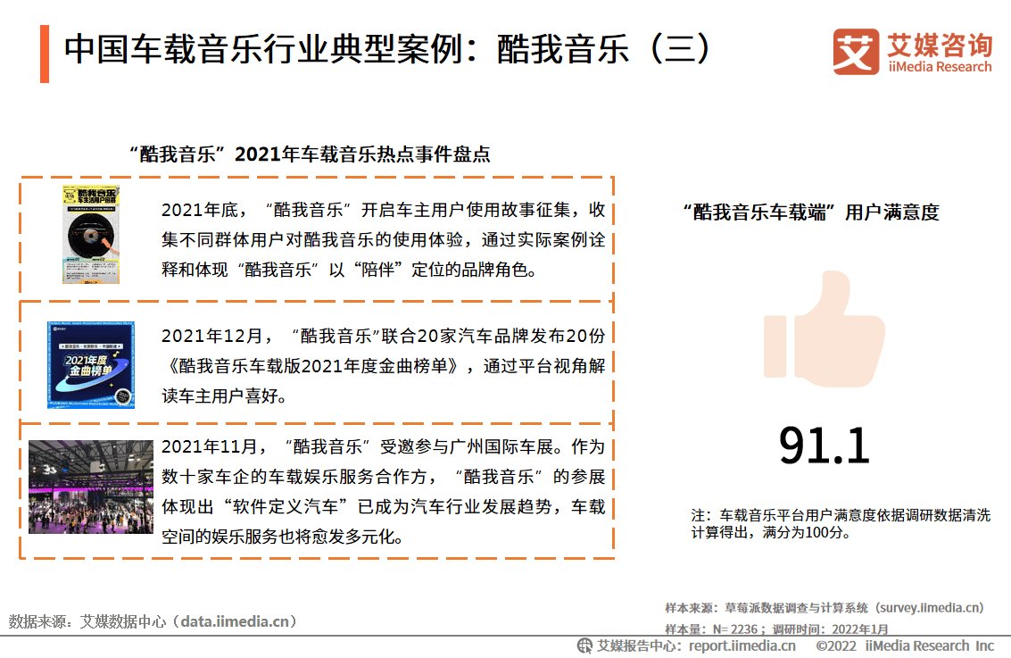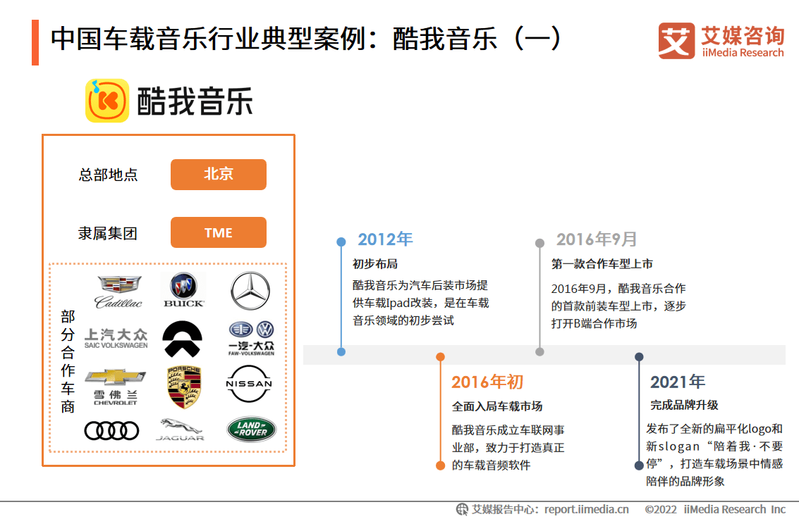 多元化:抢占先机,海量音乐的沉浸式体验 车载音乐市场是伴随着“汽车时代”而兴起的。十几年前,酷我音乐作为早期“桌面音乐”的播放器,敏锐洞察到车载音乐巨大的发展潜力。起初,酷我音乐为汽车后装市场提供了车载iPad的改装,满足车主们在车上听音乐的需求;随后,随着5G、V2X等技术的进步,车联网进一步起势,酷我音乐从2016年开始成立车联网事业部,全面布局车载市场。 2016年以车载音频软件“酷我音乐2.0版”为标志,酷我音乐的车载步伐进一步加快。2016年9月,第一款合作车型上市。众多汽车品牌与酷我音乐合作,预装酷我的车载音乐系统。顺应物联网时代多终端消费的趋势,酷我音乐的账号可同时在手机、汽车等多个终端设备中通用,极大地方便了消费者的“无缝”音乐体验。