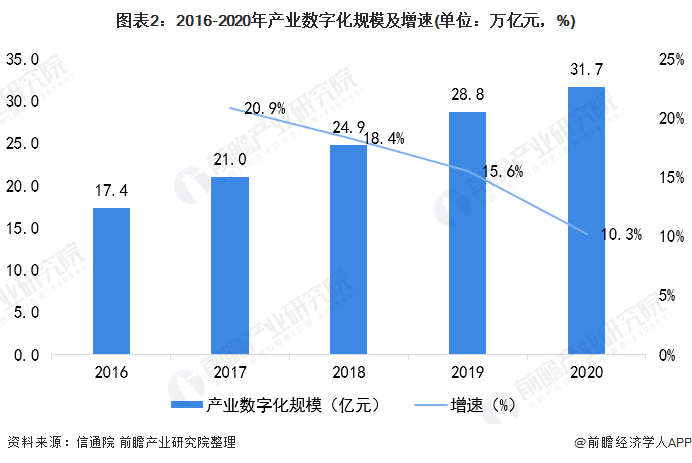 产业数字化规模超31万亿 2016-2020年,中国产业数字化规模逐年上升,增速有所放缓。2020年我国产业数字化规模约为31.7万亿元,同比增长10.3%。