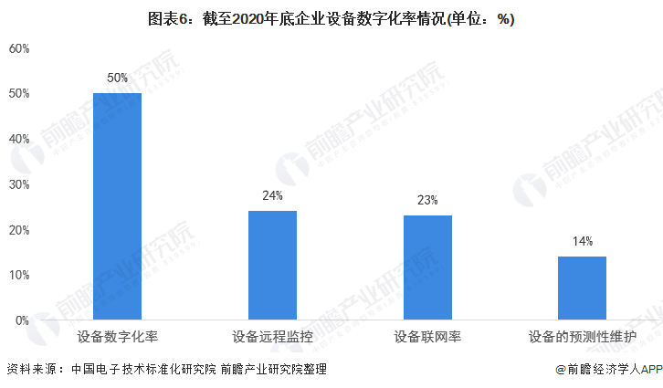 ——智能制造 设备的数字化和网络化是智能制造的基础,截至2020年底,企业设备的数字化水平已有明显改进,设备数字化率达到50%,完成设备联网和设备运行数据采集的达到23%,实现设备远程监控的达到24%,开始探索设备预测性维护的达到14%。