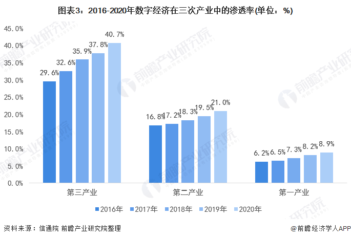 产业数字化转型提速 2016-2020年,中国数字经济在三次产业中的渗透率不断提升。2020年我服务业、工业、农业数字经济渗透率分别为40.7%、21.0%和8.9%,产业数字化转型提速。