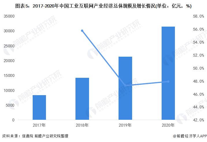 ——工业互联网 2018年、2019年我国工业互联网产业经济总体规模分别为1.42万亿元、2.13万亿元,同比实际增长分别为55.7%、47.3%。经初步统计,2020年,工业互联网产业经济总体规模约为3.1万亿元,同比实际增长约为47.9%。