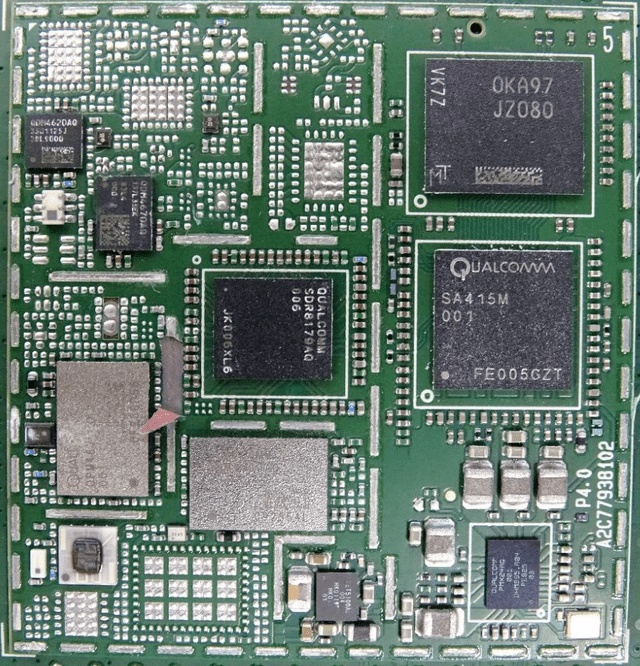 ▲图4. Tbox的主要模块组件 主通信模块屏蔽罩拆开可以看到,主要的通信块是高通的SA415M和SDR8179AQ,上方的芯片为JZ080, QPM4620AQQDM4670AQ。