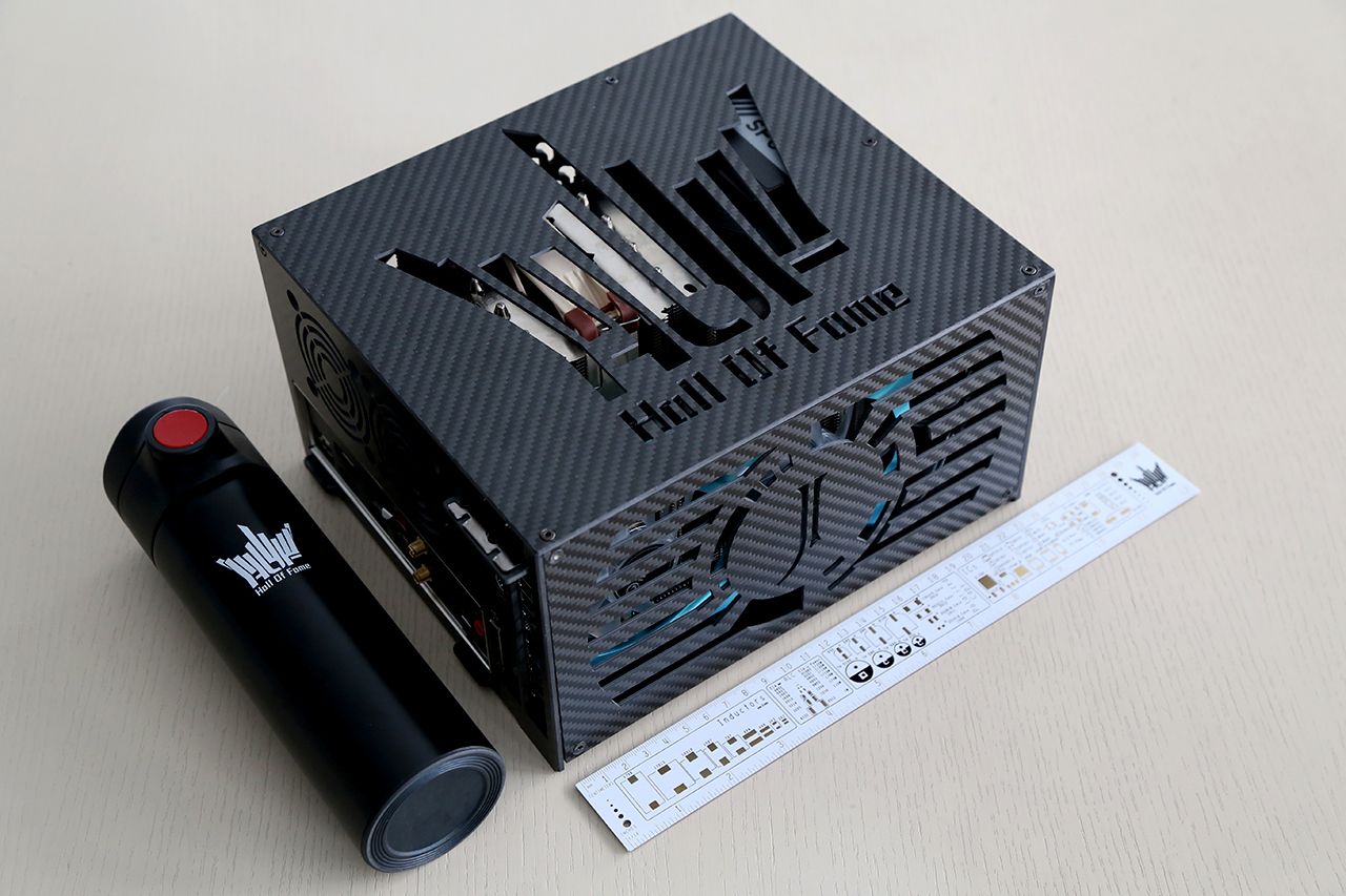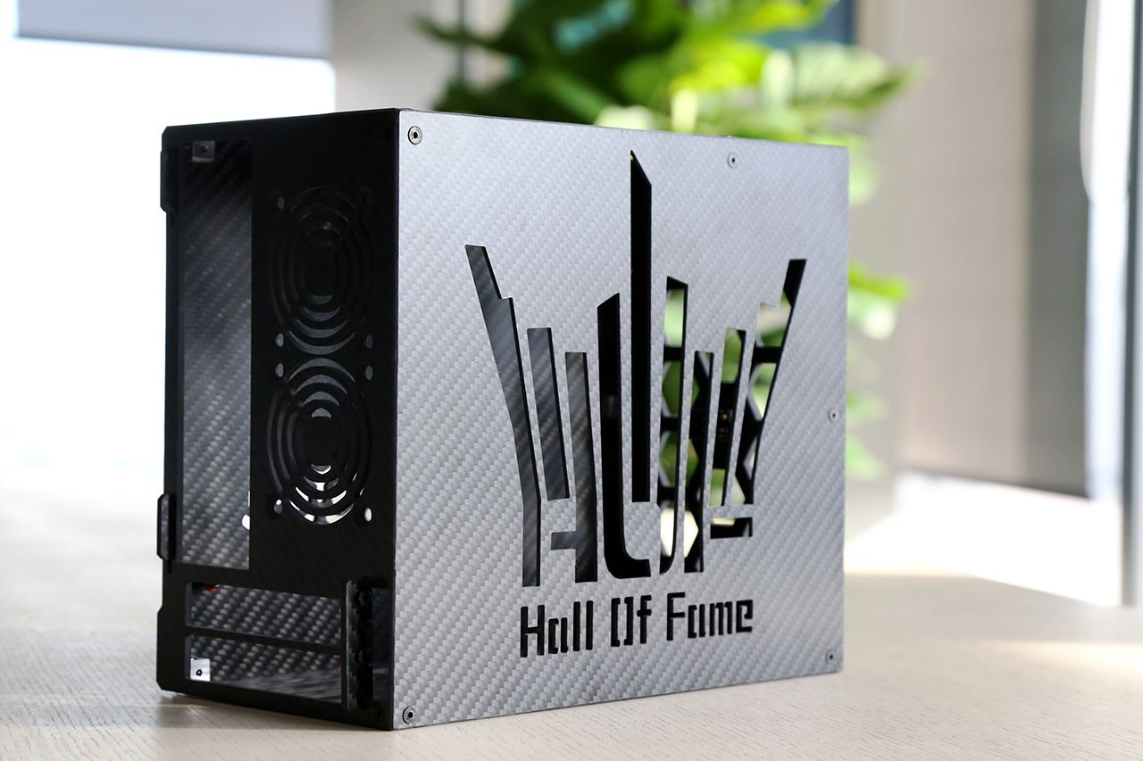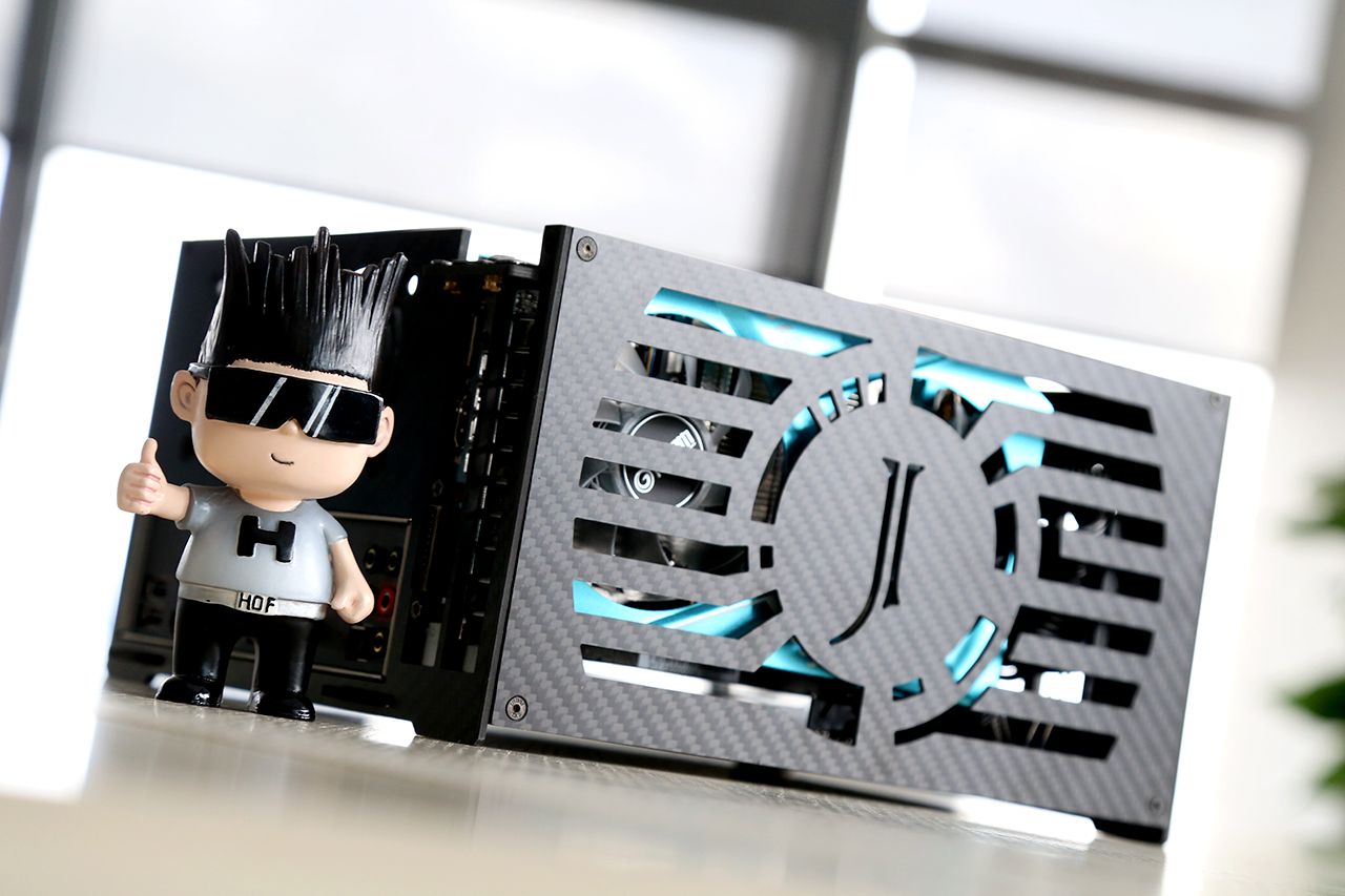 伊噜咔 L01碳纤维 私人定制机箱,规格:24cm*21cm*13cm。碳纤维材料具备耐高温、抗摩擦、导热等特性,加之机身蜂窝孔等散热孔的设计,整体散热还算有保障。另外,定制的HOF logo以及代表我名字的J字母镂空,另有什么理由不喜欢呢?