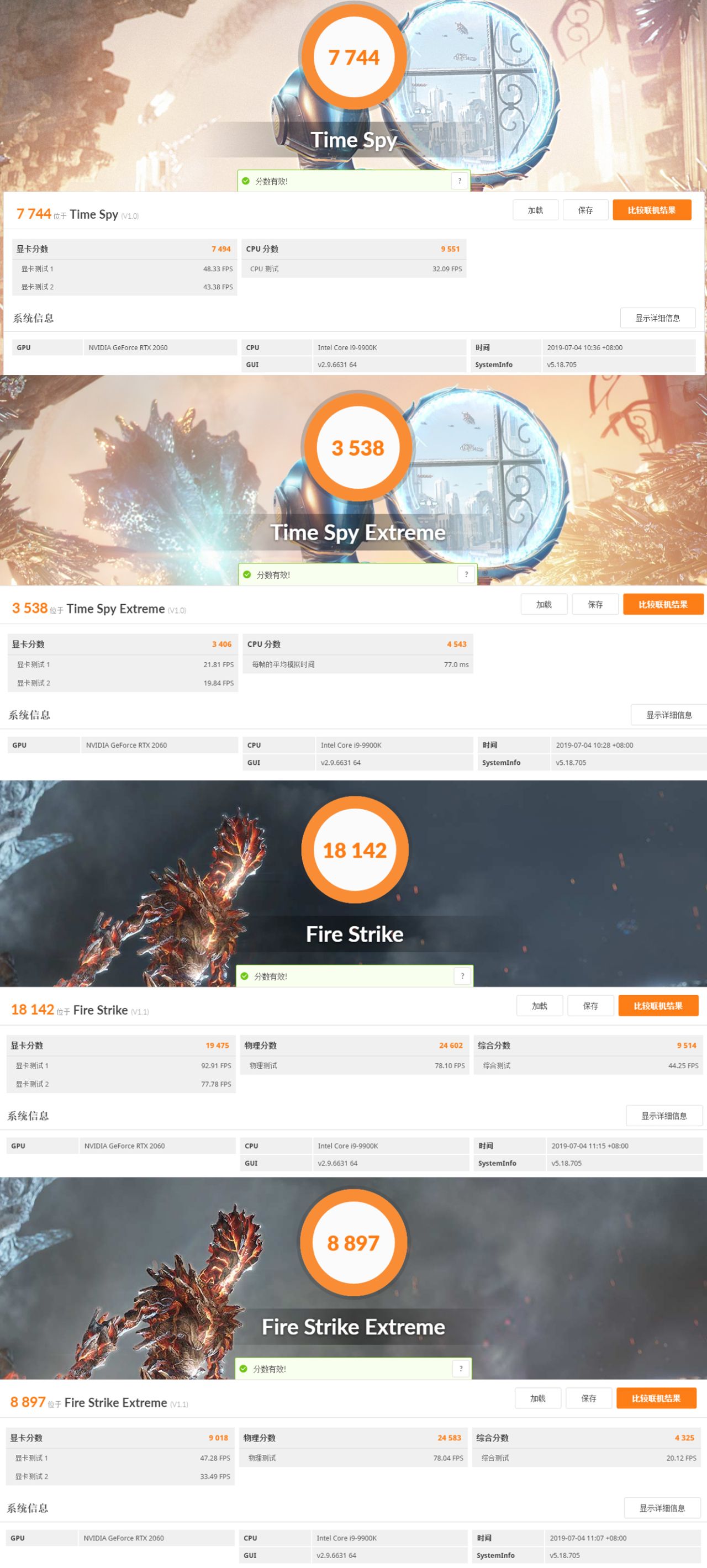 3D Mark测试。Time Spy显卡得分7494;Time Spy Extreme显卡得分3406;Fire Strike显卡得分19475;Fire Strike Extreme显卡得分9018。