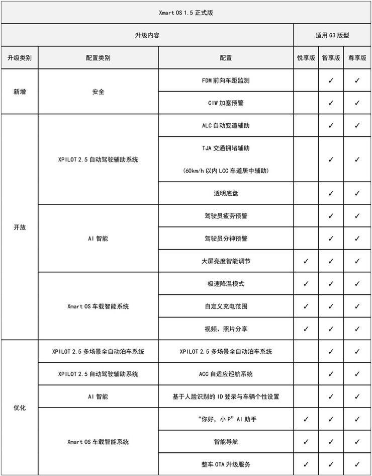 人工智能功能进级则包括了驾驶员疲劳预警、驾驶员分神预警、大屏亮度智能调理、人脸辨认ID登录优化等功能。 此次的OTA进级,意味着小鹏G3(参数|图片) 2019款车主(智享版、尊享版)能够享受到与2020款车主等同级的L2.5级自动驾驶辅助功能。据雷锋网新智驾领会,小鹏G3上市至今,累计新增55项功能,优化或者进级功能达939项。 这是在G3 2020款上新致使部门2019款车主情绪发酵风浪之后,小鹏继补助方案发布的又一动作。虽然此次进级不乏抚慰G3 2019款老车主的意味,但从以往的OTA进级的节拍来看,小鹏正在兑现其诺言。