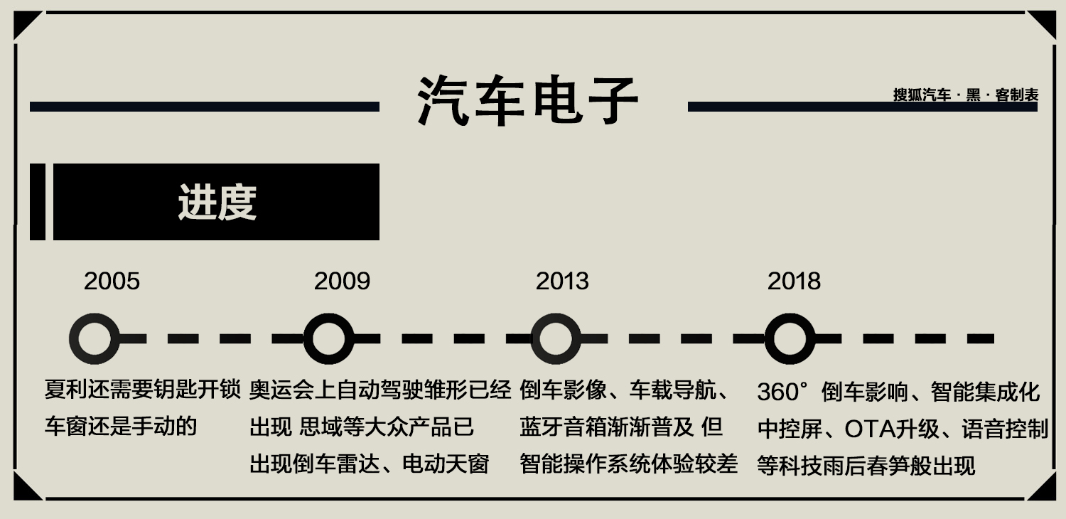十多年前,正在2000年头,咱们的汽车产物的电子化水平较差,汽车的次要罪能是代步。大都汽车都还必要用钥匙机器开锁、车窗还必要手摇、坐正在车上能听个支音机就使人无比惊喜了。