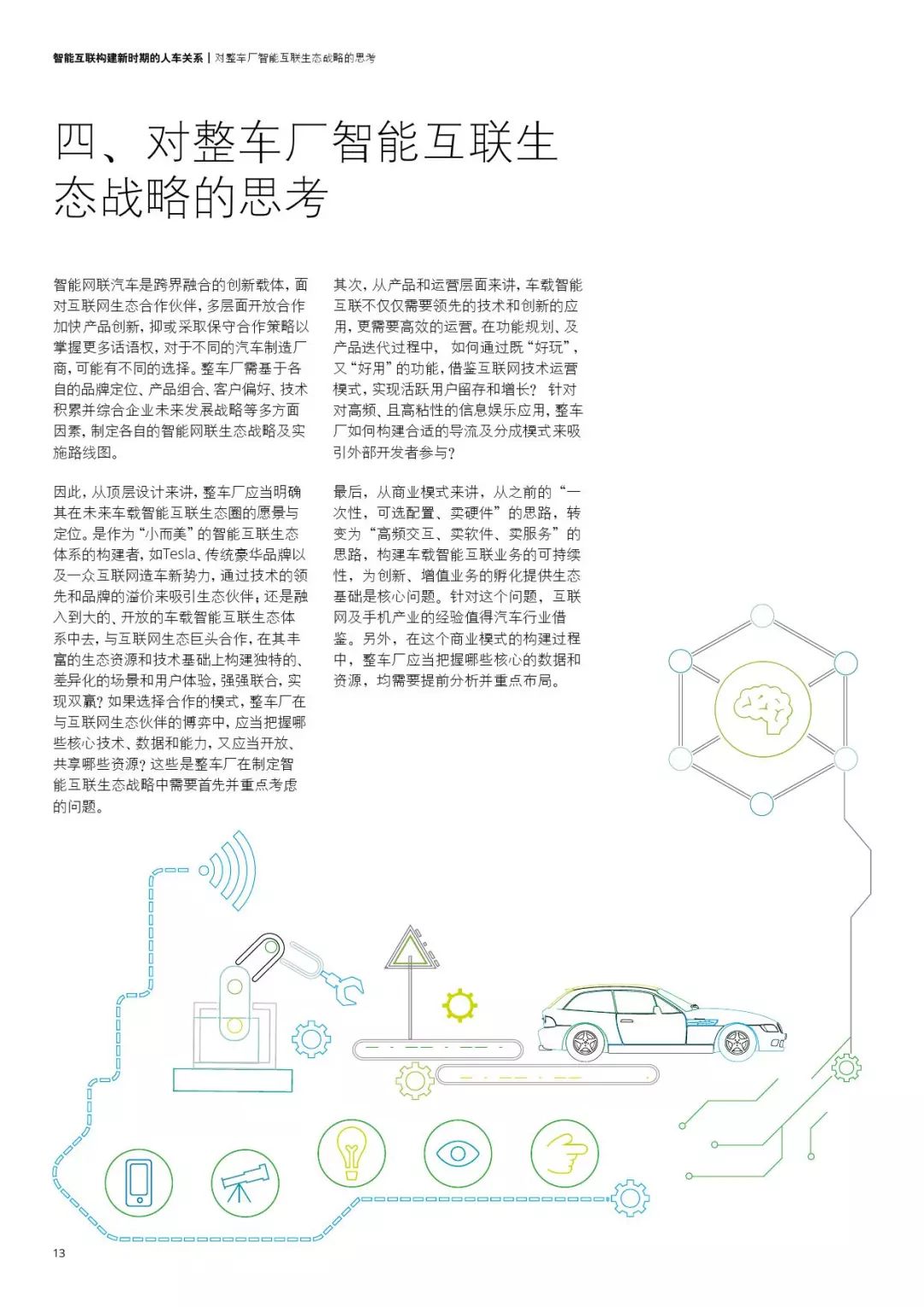 企创网:《智能互联构修新时代的人车瓜葛》陈述基于今朝市场取宏观情况的变革预测了将来智能互联时期的人车瓜葛。并对将来车联网工业链中,整车厂商取互联网企业、高科技企业之间的竞折瓜葛取成长趋向入止了论述,还提出了整车厂商将来有待思虑的问题。