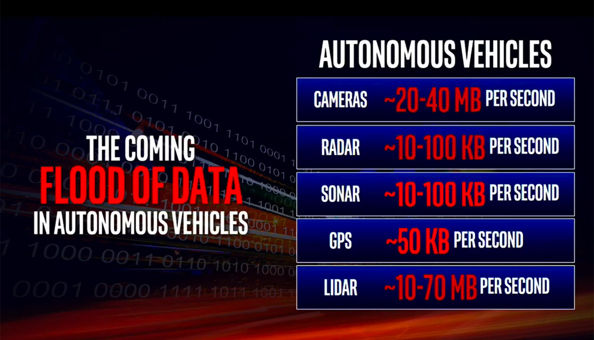 (英特尔高级副总裁兼无人驾驶事业部总经理戴佟森) 不仅如此,在过去两年,英特尔也整合了行业内的不少相关公司,从 2016 年开始,算上最近收购的Mobileye,他们已经先后收购了 6 家自动驾驶领域相关的公司。 英特尔想在无人驾驶领域建造一个通用的平台,这个平台将根据各个汽车客户不同的需求进行定制,提供端到端的解决方案。 戴佟森认为通用平台和可预测的接口组织技术能够很有效地解决问题,也是推动无人驾驶向前发展的最快速方式。 而其中最关键的,就是英特尔的传统强项——数据处理。每辆自动驾驶汽车的摄像头、激光雷达等部件每秒钟都能产生上百兆的数据,英特尔 CEO 柯再奇在洛杉矶车展上曾经说过:未来每辆自动驾驶平均每天会产生 4000 GB 的海量数据。而不同的汽车厂商可能会使用不同的解决方案,有的侧重用激光雷达,有的侧重用摄像头,不用的方案所产生的数据,有着截然不同的处理方式。