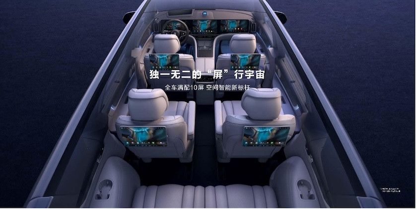 问界M9搭载全新HarmonyOS 4与全新HUAWEI SOUND卓越系列,全车满配10块屏幕,同时小艺首次搭载AI大模型,为用户创出更多全场景可能。 问界M9全车满配可达10块屏幕,随时满足用户驾驶、娱乐、工作的全场景需求。其中,业界首款车规级投影系统上车,配合32英寸升降式投影幕布,完美复刻影院级观影体验,并且久看不晕车、不伤眼。问界M9车内所有屏幕均内装全新HarmonyOS 4,升级方舟引擎,丝滑流畅再加倍,轻松实现多人多屏多设备交互的革命性体验。