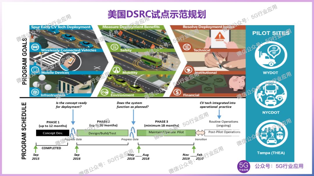 美国正在2015年9月起头启动怀俄明州、纽约、佛罗里达州Tampa三地的DSRC试点示范事情。2016年12月完成第一阶段观点设计。2018年5月完成第二阶段设计/制作/测试。今朝入进第三阶段经营和维护验证。