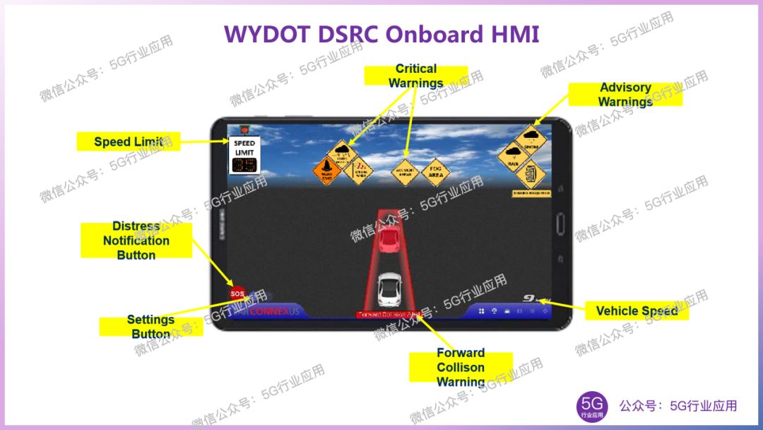 WYDOT的典范车载末端有Onboard HMI装备,能够望到紧张告警疑息(比方极度大雾气候、路线施工等)、通俗告警疑息(比方雨雪气候等)、限速疑息、前向撞碰预警、车辆速率疑息等等。