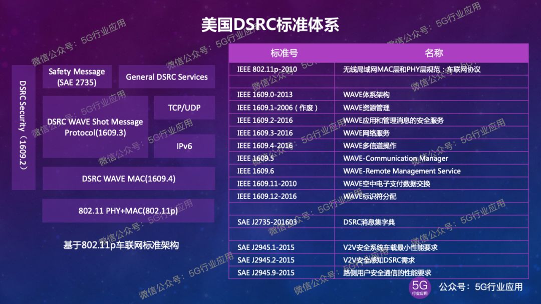 第一个尺度是IEEE 802.11p,它界说了汽车相干的“公用短间隔通讯”(DSRC)物理尺度; 第二个是IEEE 1609,题目为“车载情况无线接进尺度系列(WAVE)”,界说了网络架构和流程; 第三个是SAE J2735和SAE J2945,界说了动静包中携带的疑息,该数据将包含来自汽车上的传感器疑息,比方位置、止入标的目的、速率和刹车疑息。
