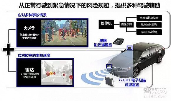 该系统采用微波雷达检测前方约100米以内的行驶车辆,通过与前方车辆的距离、相对速度以及车辆自身的预测前进方向等判断碰撞发生的危险性,然后通过警报音和身体感应报警等促使驾驶员认识险情并采取防范措施。同时通过补充驾驶员制动脚踏力不足的制动辅助、提高对乘客束缚力的安全带控制以及碰撞前的制动控制降低车速等减轻碰撞时的伤害。不久之后,这套系统便被雅阁车型搭载。 随后本田的科技树主要往安全方面点,对自动驾驶属性的功能还真不怎么上心。 直到2014年,汽车辅助驾驶功能经过日新月异的发展后,本田于推出了一整套辅助驾驶的打包集合——Honda sensing。整个系统使用后视镜处的单目摄像头和车头的毫米波雷达两种传感器进行感知,包含了车道保持辅助系统LAKS,车道偏移抑制系统,带有低速追随模式LSF的ACC以及交通标志智能识别功能TSR,以及前面提到的碰撞减轻制动系统CMBS。