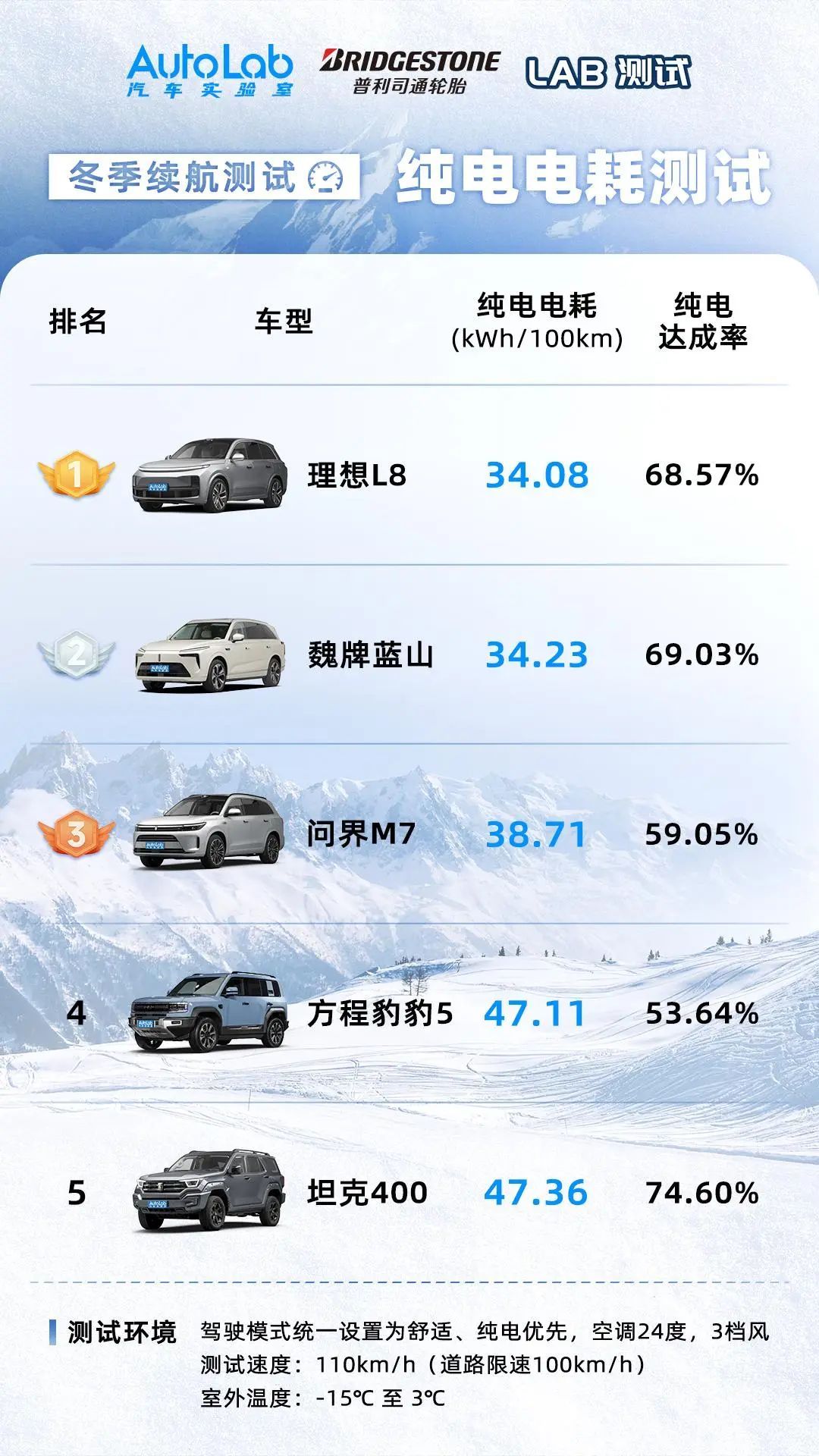 至此,AutoLab第三届冬测大横评正式结束。在接下来的一周内,我们将会针对每一辆车,从续航、空调等维度上单独解析,敬请期待。 |