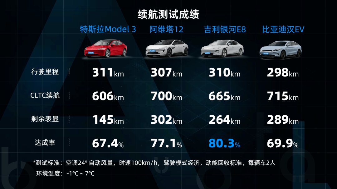 至于已经3年前的比亚迪汉EV了,风阻系数是四车中最高的0.233,纯电达成率上面对银河E8和阿维塔12这些拥有更新技术的后起之秀,显得力不从心,最终实测续航达成率仅不到7成。