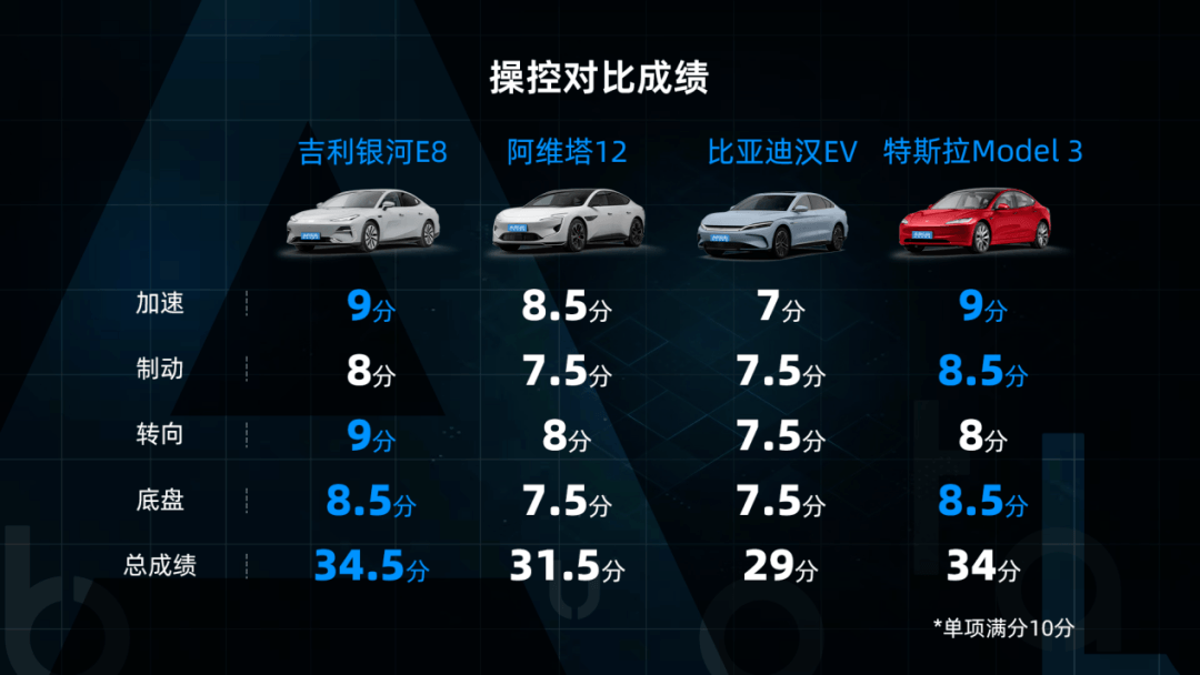 在从续航、充电、智舱到驾控,总计四个维度的对比中让人稍感意外的是,吉利银河E8的表现非常出众,而阿维塔12、小鹏P7i等也都在测试中表现了不错的产品素质。