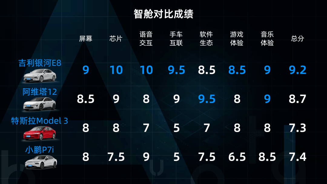 至于特斯拉Model3焕新版,作为打入国内销量最好的外国新能源品牌,哪怕经历了一次改款,体验还是熟悉的味道,几轮测试下来只有一个开机速度拿了个第一,在吉利银河E8、阿维塔12、小鹏P7i面前已经有点不够看了。