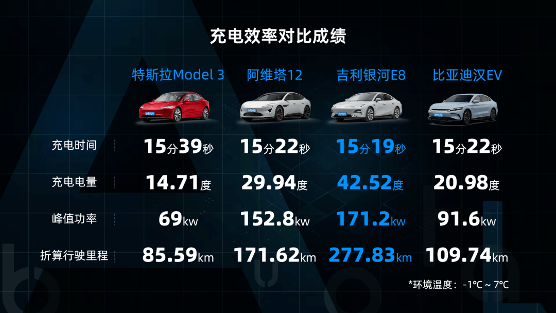 最终实测下来,充电速度最快的依次是吉利银河E8、阿维塔12、比亚迪汉EV、特斯拉Mode 3。