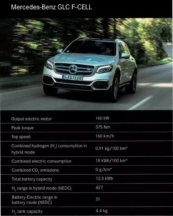 (由于电量实在太大,所以EQ POWER车型都配备交流、直流两个充电接口,以GLE插混为例,如果用10安培交流电,11个小时都充不满;而用150安直流电,20多分钟就能充到80%。当然,多一个快充接口,成本无疑也会更高。) 在试驾现场和奔驰的一个年轻工程师聊到这个话题,他个人很认同这个看法,他表示GLE插混搞这么大的电池实在是无奈之举,因为中国最新的新能源汽车产业政策要求插混的纯电续航要超过100公里。所以,GLE插混可以视为是为中国市场——准确点也许应该是中国产业政策——量身定制的一款车。据悉,GLE350 e 4MATIC插混明年就会引进到中国。 3,世界唯一一款“插混FCV” 最后试驾的这款车非常抢手,我排了好长的队才试到。 它是GLC F-CELL。 它是一款氢燃料电池车(FCV),同时也是一款插电混合动力车(PHEV)。 它的动力总成由一台氢燃料电池堆、能储存4.4公斤液态氢的储氢罐、13.5kWh的锂离子电池、160kW的驱动电机组成,它也是世界上唯一一款“氢电混合”的PHEV。