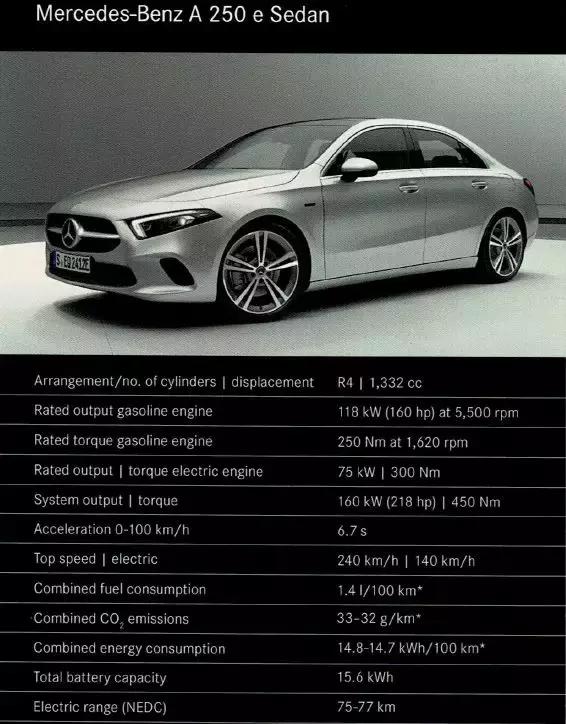 (试驾车型多,试驾路线也有3条,媒体可以自由选择。绿色1号路线是市区+高速,单程28公里;红色2号路线是市区+郊区路,单程28公里;黄色3号路线基本是郊区道路,单程17公里。) 之前奔驰的插电混动车型(PHEV)市场表现一般,一个很重要的原因就是纯电续航里程太短,C级(参数|图片)、S级(参数|图片)和GLE原先在中国市场都有插混版销售,但是纯电续航里程都只有30-32公里,相应地电池电量也只有6.2-8.8度不等,现在这几款车在中国市场都已经相继停售。 奔驰第三代EQ POWER全系都大幅提升了电池容量和纯电续航里程。比如我这次试驾的A250 e轿车,电池电量提升到了15.6度,纯电续航里程达到了77公里,已经优于市面上多数PHEV。这款车的动力系统由一台75千瓦电机、一台118千瓦的1.33升涡轮增压发动机,以及一台8速双离合自动变速器组成,系统最大输出为160千瓦、450牛米——对于一款紧凑型轿车,这个动力输出相当强悍。