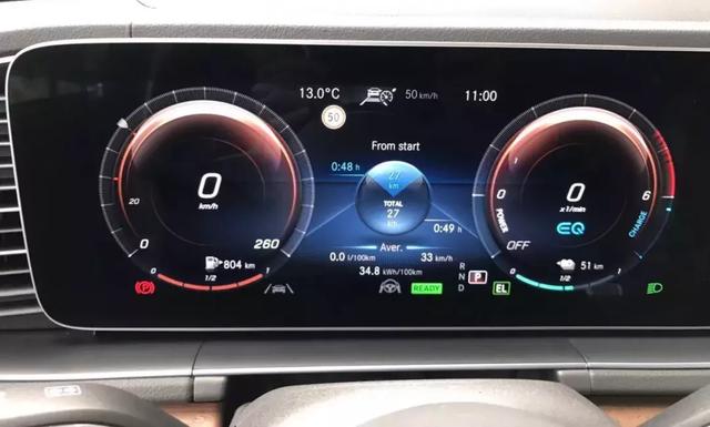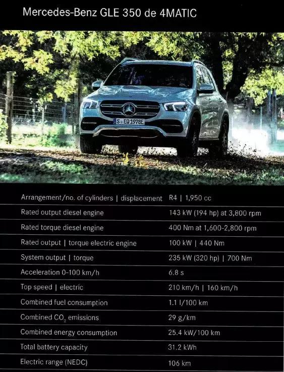 1.4升的综合百公里油耗,当然也是根据公式算出来的,插电混动的能耗水平,应该分两种情况来看:一是纯电模式下的电耗,二是混动模式下的油耗。我们采用日常驾驶模式测得A250 e的表显纯电能耗是百公里14.4kWh(上图),比官方宣布的14.8kWh要略低。这应该和我们走的2号路线有关,这是一条郊区为主市区为辅的路线,车速适中,比较适合纯电驾驶。 2,GLE插混:这么大的电池真的好吗? 相比起来,GLE350 de 4MATIC的纯电能耗就有点让我吃惊。 首先这是一台柴油插电混合动力车,搭载143千瓦2.0升增压柴油发动机、100千瓦电机,综合最大输出235千瓦/700牛米,官方百公里综合油耗只有1.1升!