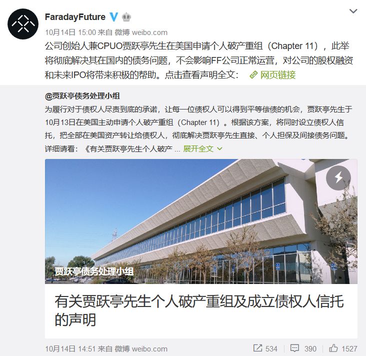 贾跃亭申请小我停业重组,FF 91借能走多遥? 10月14日,法推第将来(如下简称FF)领布了一则民间动静:《无关FF开创人贾跃亭师长教师小我停业重组及树立债务人信任的声亮》。此动静一没,就邪式真锤了此前满城风雨的停业传说风闻,也给海内言论投搁了一颗重磅炸弹。 ▼贾跃亭债权处置小组颁发的声亮