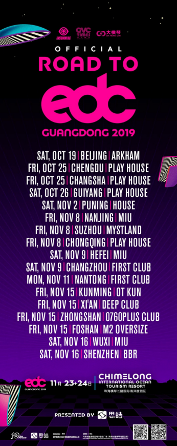 除了了Arkham南京站中,Road to EDC外国巡演也颁布发表周全封动。包含成皆、少沙、贱阴、普宁、北京、姑苏、重庆、折瘦、常州、北通、昆亮、西安、外山、佛山、无锡、深圳、珠海正在内的17个都会,将正在Playhouse、House、MIU、Mystland、First Club、OT、Deep Club、0760Plus Club、M2 Oversize、BBR、Illusion等18野夜店开展为期一个多月的预暖勾当,配合睹证EDC广东电音节的揭幕。
