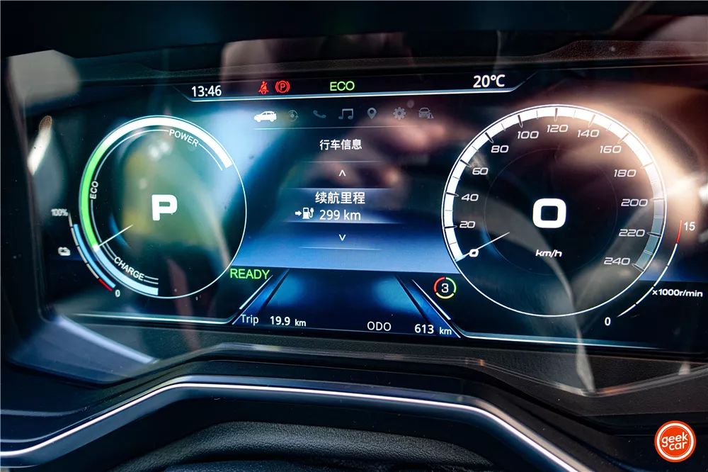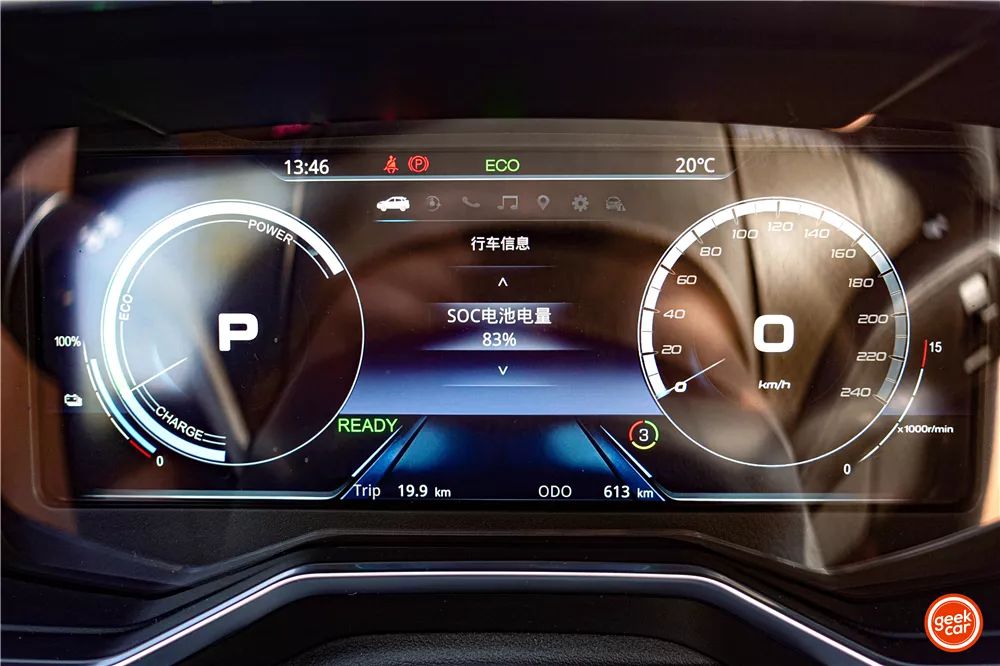 正在达到动态拍摄地址时,小计面程为 19.9km,SOC 残剩电质为 83%,续航面程为 299km。