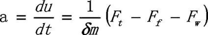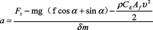 (10) 式外,Ft、Fi、Ff、Fw划分是驱能源、风阻、轮胎阻力以及叙路坡度阻力;δ为旋转量质换算系数;m 为零备量质。