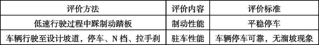 以上各工况复测3次记实成效,测试成效讲明:造动劣先相应。 造动及驻车机能次要评估低速止驶进程外踏造动踩板的造动机能以及车辆止驶至设计坡叙,泊车、N档、推脚刹的驻车机能,评估尺度划分是安稳泊车以及车辆泊车靠得住且无溜坡征象。 表8 造动机能评估阐发