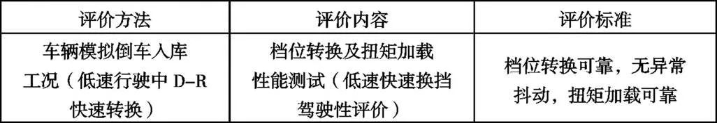 以上各工况复测3次记实成效,测试成效讲明:D/R档切换刹时,机电转速存正在20rpm的跳变,客观感觉零车有打击感,机电反映扭矩存正在0Nm跳变,高一步需存眷。 摹拟进库次要评估档位转换及扭矩添载机能测试(低速快捷换挡驾驶性评估),评估尺度是档位转换靠得住,无异样发抖,扭矩添载靠得住。 表5 摹拟进库机能评估阐发