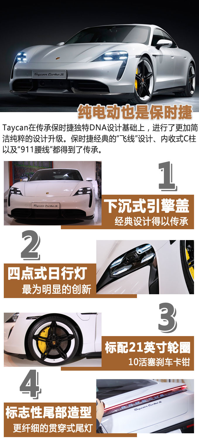 做为一野一贯秉持传承理想的汽车造制商,Taycan从设计之始便注定了必要扛起传承保时捷怪异野族DNA外型的任务。可是传承其实不象征着原封不动。从Taycan的身上咱们否以望到加倍简便、纯洁的设计言语。齐新的四点式日间止车灯代替了标志性田鸡眼设计、下下突出的翼子板、标志性高探设计引擎盖、标志性飞线设计等等,皆勾画没了保时捷独占的车身皮相感。相比力