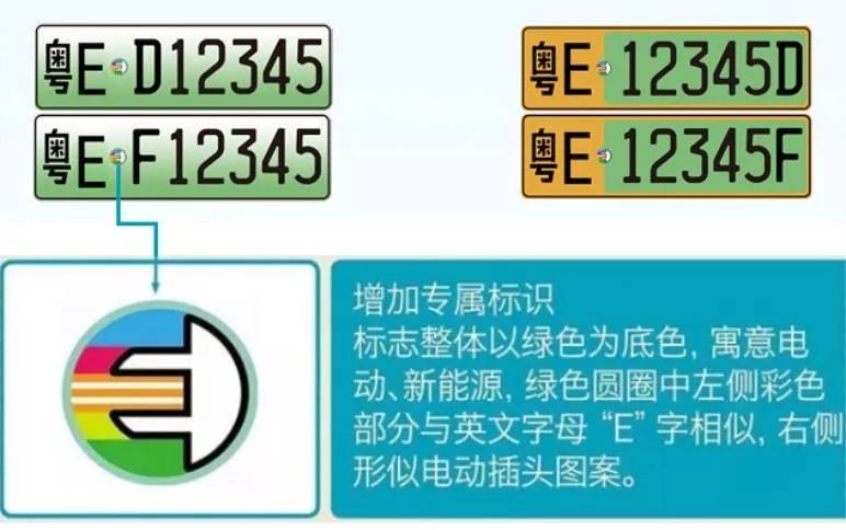 02 删设公用标志 取现有的平凡汽车号牌相比,新动力汽车号牌增长公用标志,标志总体以绿色为底色,寄意电动、新动力,绿色方圈外右边为电插头图案,左边彩色部门取英文字母“E”(electric,外文翻译为“电”)近似。