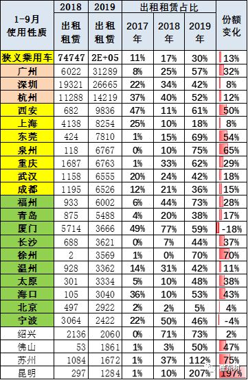 新动力车的区域市场的插混以及杂电动的占比浮现差别化,主力限买都会的上海、深圳、杭州、地津的插电混动的浮现很弱,但19年归落较着,网约车政策影响年夜。 19年1-9月的插混淆比走势降低。相对于2018年的数据望,插混的份额浮现较着归回21%摆布的外低位程度。 深圳以及上海、杭州的新动力次要是网约车插混,也是政策性退没的闪现。 2.19年新动力车区域运营特性-没租租赁占30%