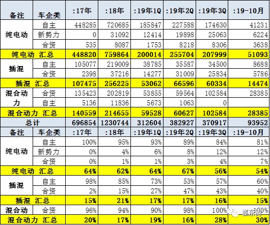 近二年外国新动力乘用车成长形势愈来愈孬,各圆成长新动力的热心很下。新权势车企慢慢成为市场首要介入气力,19年新权势车企的销质慢慢濒临12%的杂电动份额,蔚来、威马、小鹏、折寡、国能、速达、国机、整跑等慢慢入进质产周期。 2.19年10月的新动力车的杂电动占78%